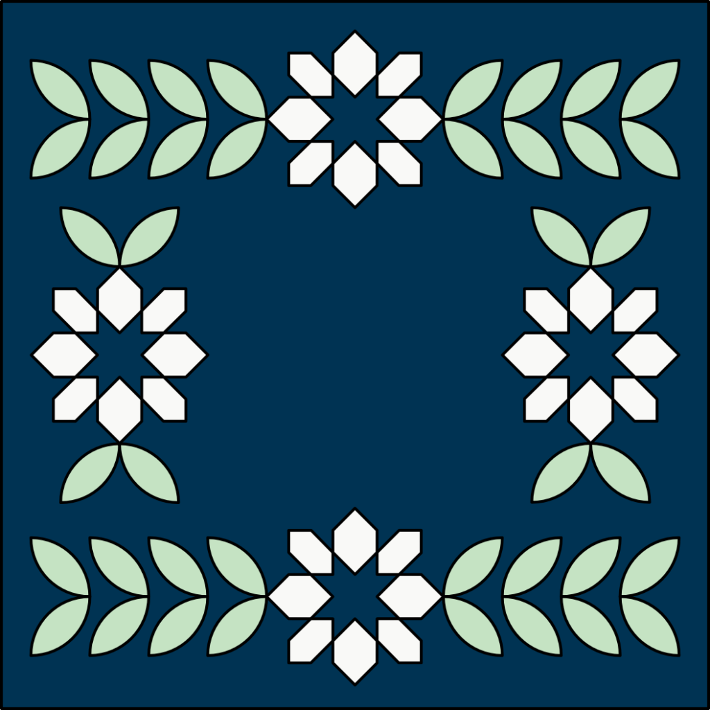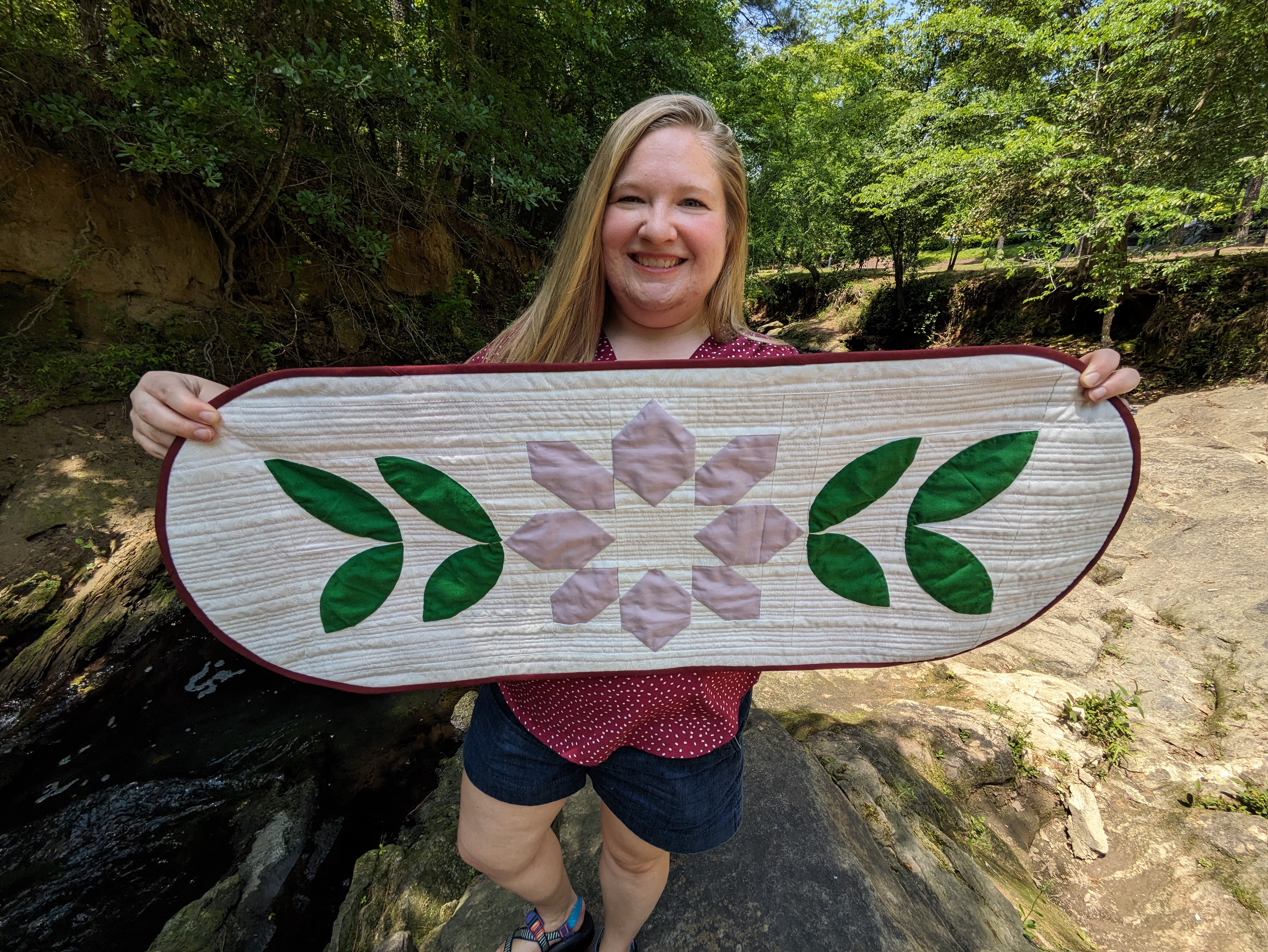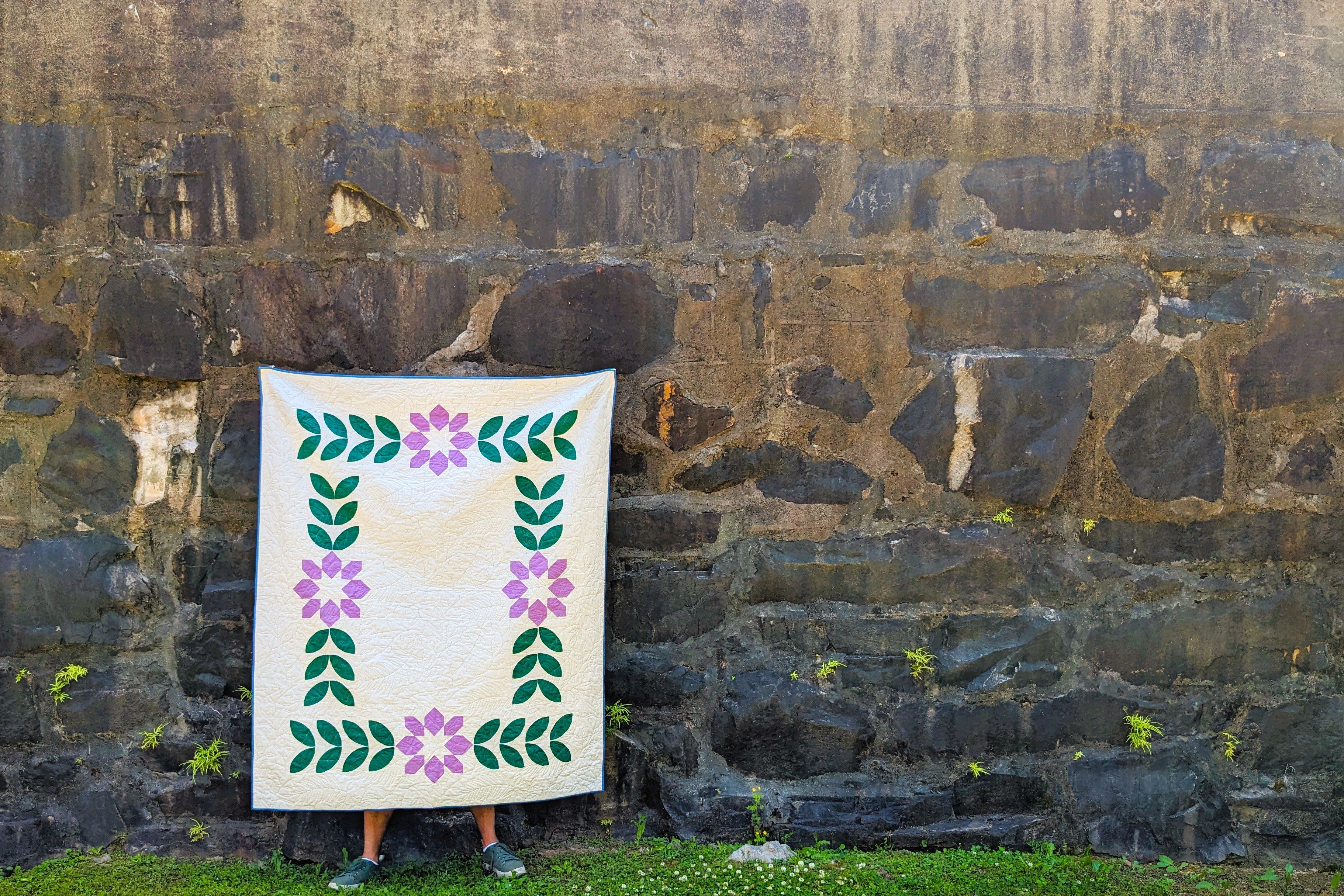 This design was inspired by a carving on the front door (hence the quilt name!) of an AirBNB my family stayed at in Americus, GA. The carving was of a flower surrounded by leaves on each side. I snapped one (blurry) photo of the front door – I loved the simplicity of the design and wanted to translate it into a quilt! I knew that orange peels would be a perfect way to emulate the leaf designs, and I used a snowball technique to build out the flowers. I had fun playing with the arrangement of these motifs on each size option that I built out while designing and writing the pattern.