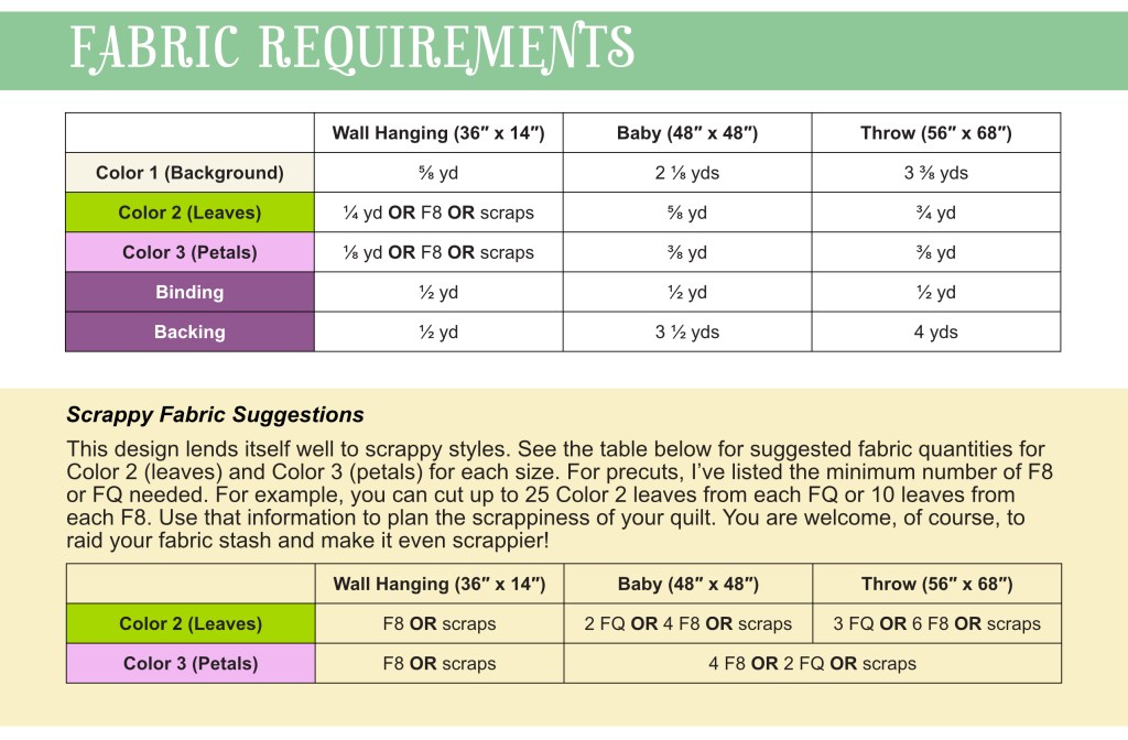 This pattern offers three sizes: wall hanging (36″ x 14″), baby (48″ x 48″), and throw ( 56″ x 68″). This pattern is considered intermediate due to the precise nature of the curved piecing in the orange peels. Templates are included, but are exact and leave little room for trimming. Fabric requirements are incldued below.