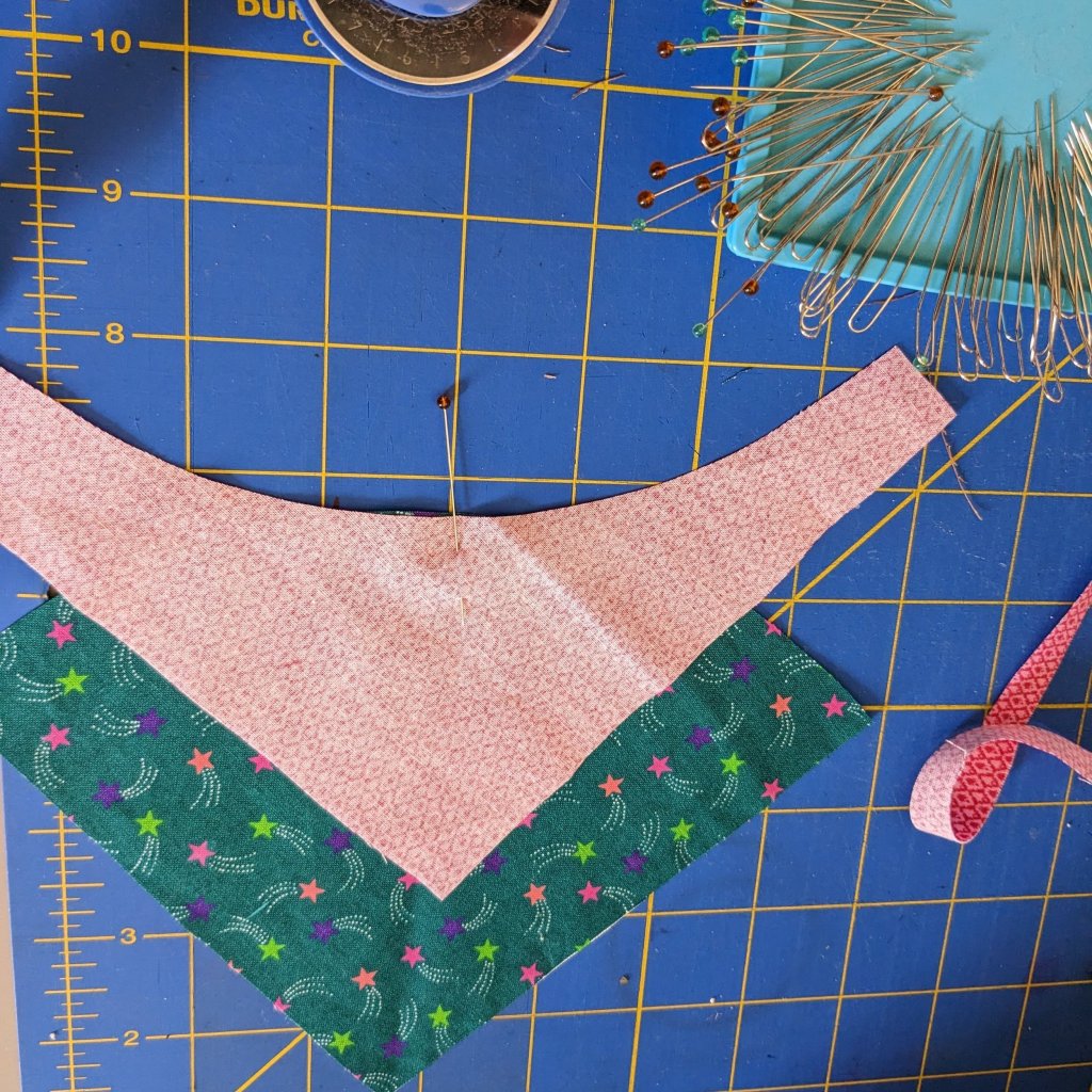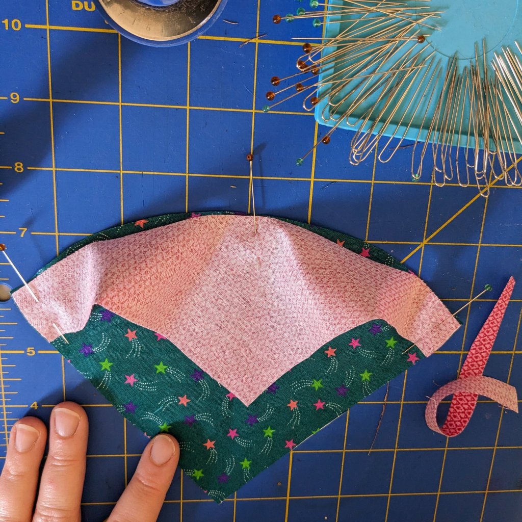 This method is my personal favorite method for sewing curves in most cases. I’ve tried the “lots of pins” method, but found that I had a hard time moving the fabric to make sure the seams were properly aligned. Even with lots of carefully-placed pins, I still needed to adjust the fabric placement, and had to stop to remove a lot of pins. I’ve also tried the no-pin method, but found that I had a hard time keeping my fabric aligned and ended up with mis-matched ends.