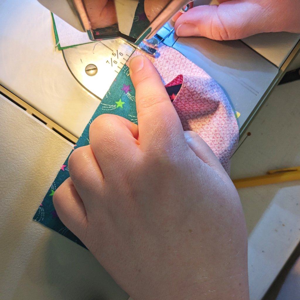 Sew your curve. Don’t be afraid to sew slowly so that you can adjust the fabric as needed. I use my fingernails or a stiletto i to push and pull the fabric gently into place. Being gentle with your adjustments helps avoid any puckers.